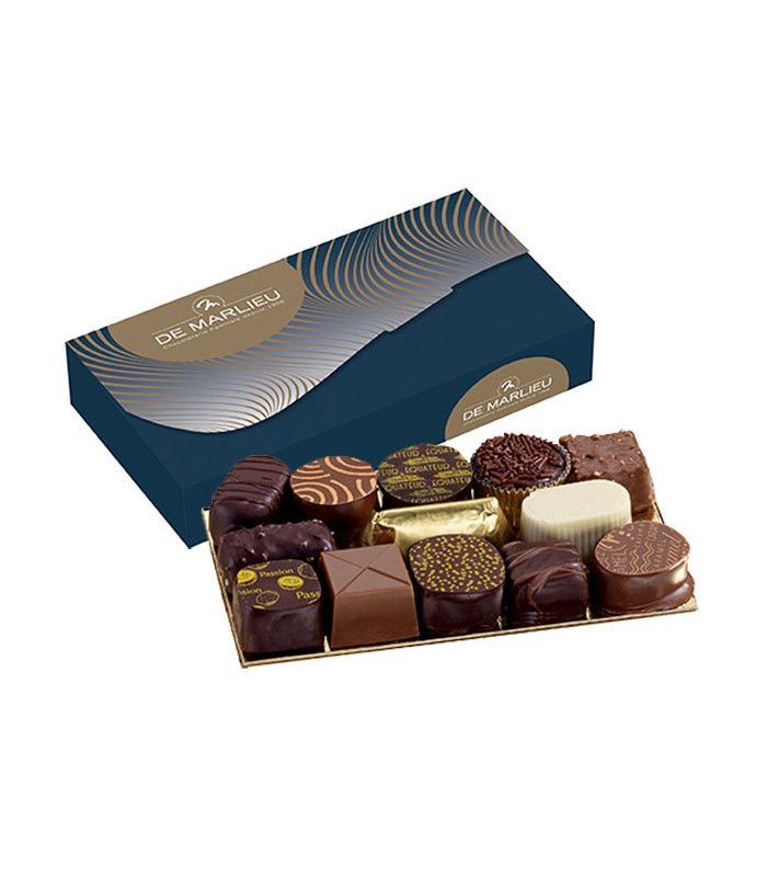 Facile à offrir ! Assortiment de 14 chocolats SANS ALCOOL présentés sans alvéole : Pralinés et Ganaches, dans une boîte tout en transparence. 140 g