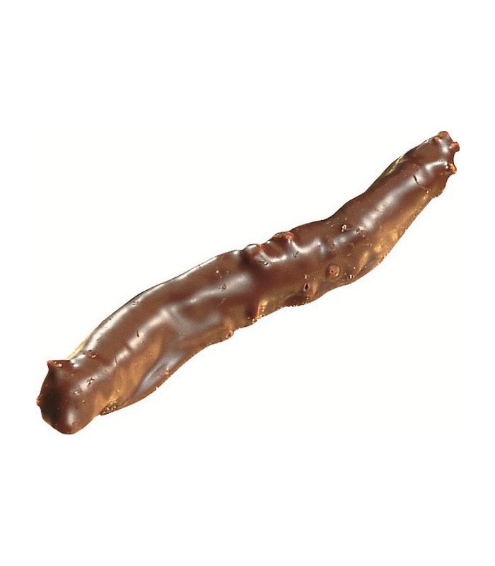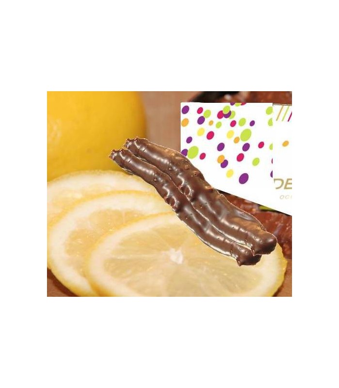 Écorces de citron confites naturellement sans conservateur enrobées de chocolat lait et parsemées de grains de noisettes.