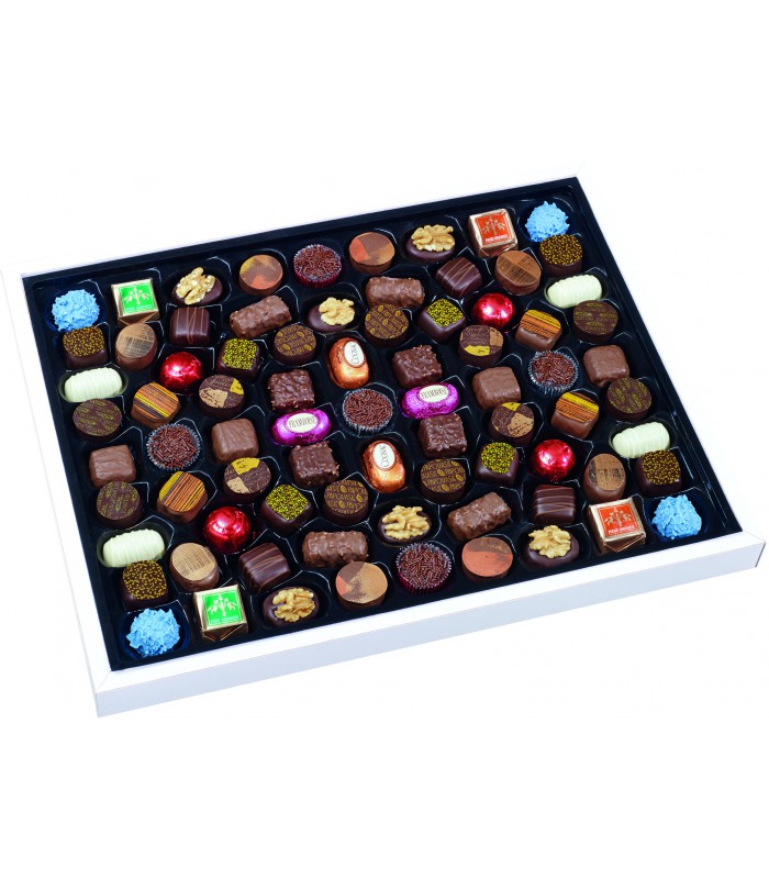 50 chocolats rangés. 19 variétés sur 2 étages : 500g de plaisir ! Assortiment de 50 chocolats rangés en alvéoles Savourez les Carré praliné Dauphin Praliné Éclats Ganache blanc Ganache lait caramel Ganache...