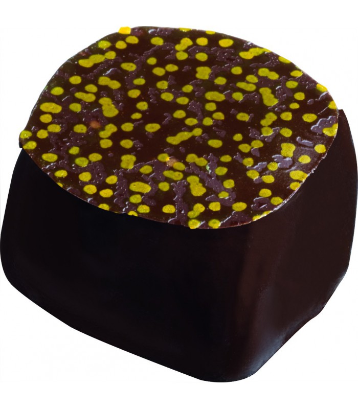 Praliné craquant parfumé à la  Poire : Fin praliné craquant à la crêpe dentelle goût poire, enrobé de chocolat noir.