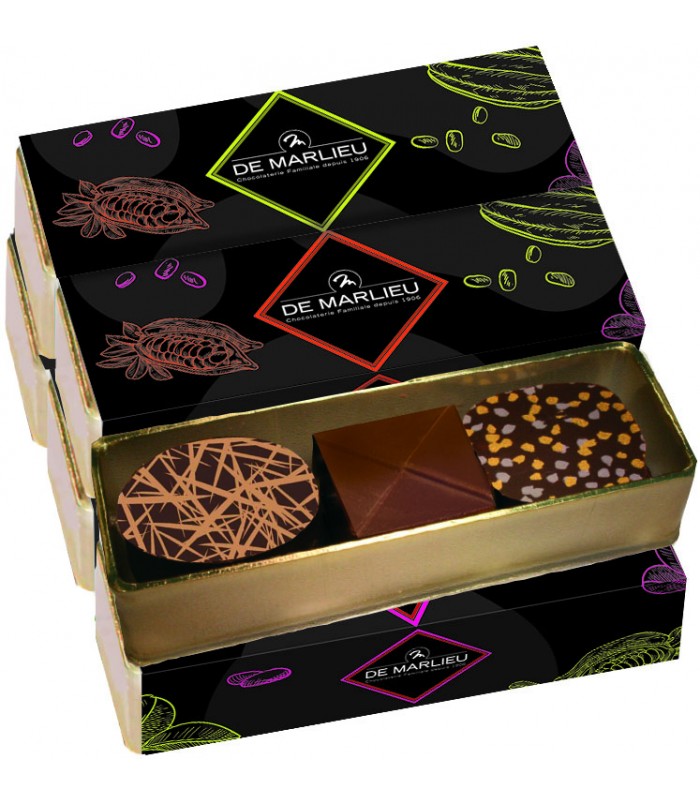 Lot de 6 étuis raffinés de 3 chocolats, qui surprendront vos invités et votre famille.